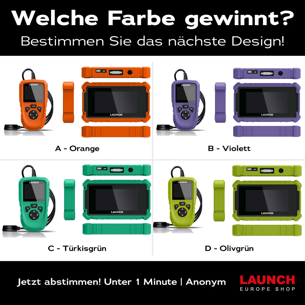 Wir entwickeln ein neues Diagnosegerät und jetzt entscheiden Sie über die Farbe. 4 Optionen stehen zur Wahl. Nur 1 geht in Produktion.
