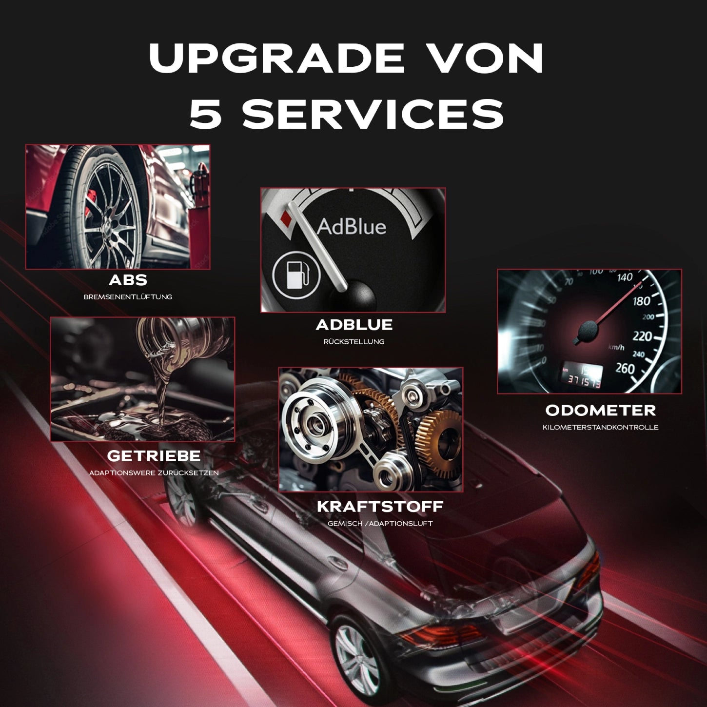 Umfassendes Servicepaket mit 5 zusätzlichen Funktionen gegenüber dem Vorgängermodell. Von Ölservice-Reset bis zu ABS-Bremsenentlüftung und Kilometerstandauslesung – alle wichtigen Wartungsbereiche für eigenständige Fahrzeugpflege.