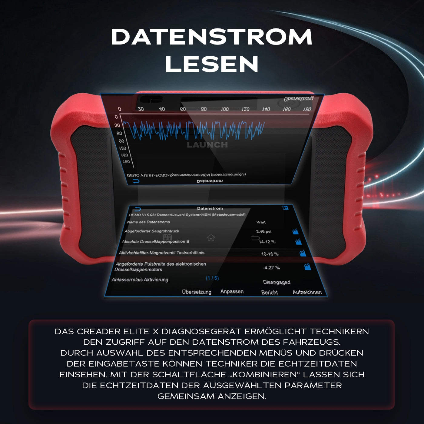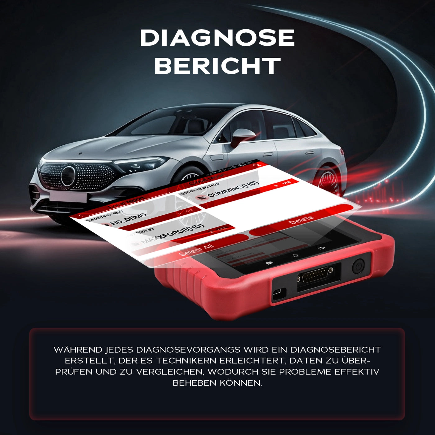 Vollständige Diagnose aller Steuergeräte mit Fehlercode-Management, Live-Datenströmen in Text- und Grafikform sowie automatischer Berichterstellung. Bidirektionale Steuerung ermöglicht Aktivtests für schnelle Komponentenprüfung.