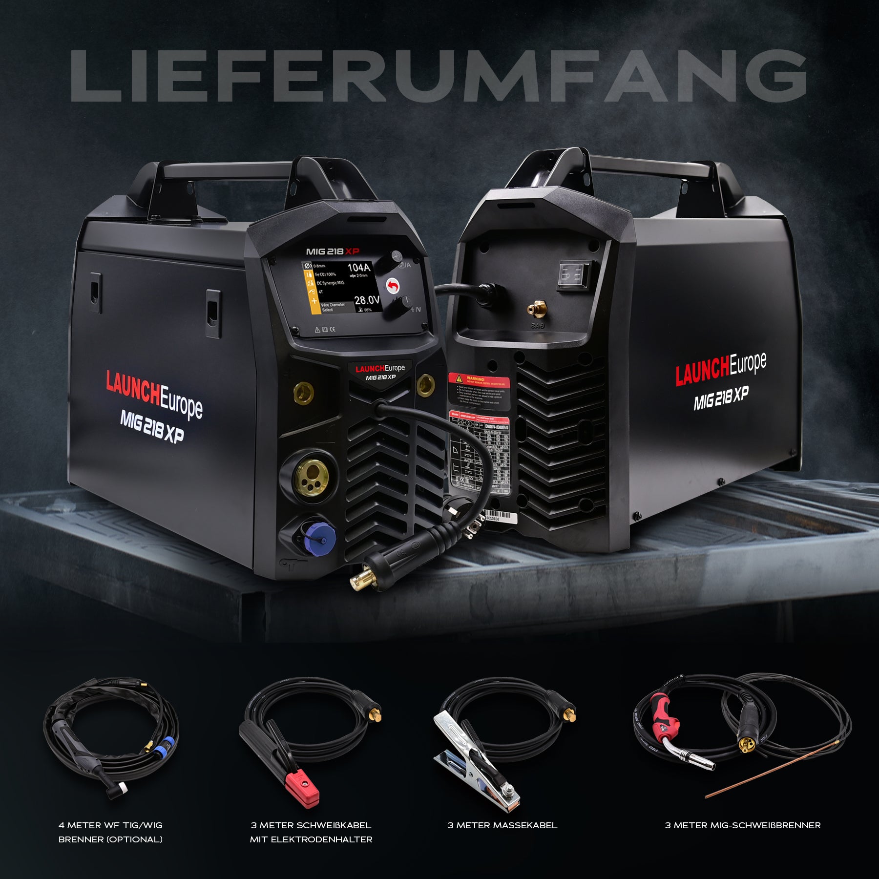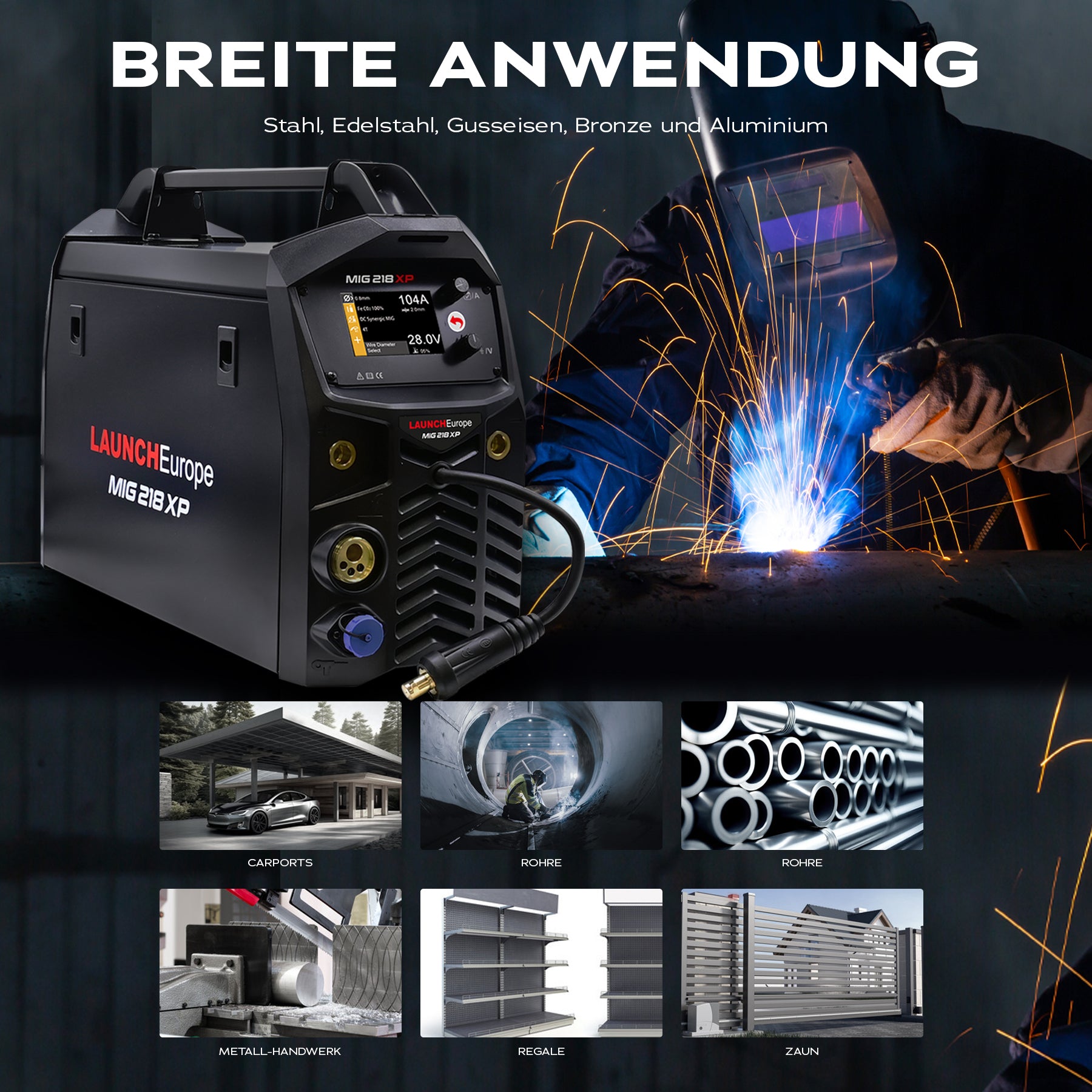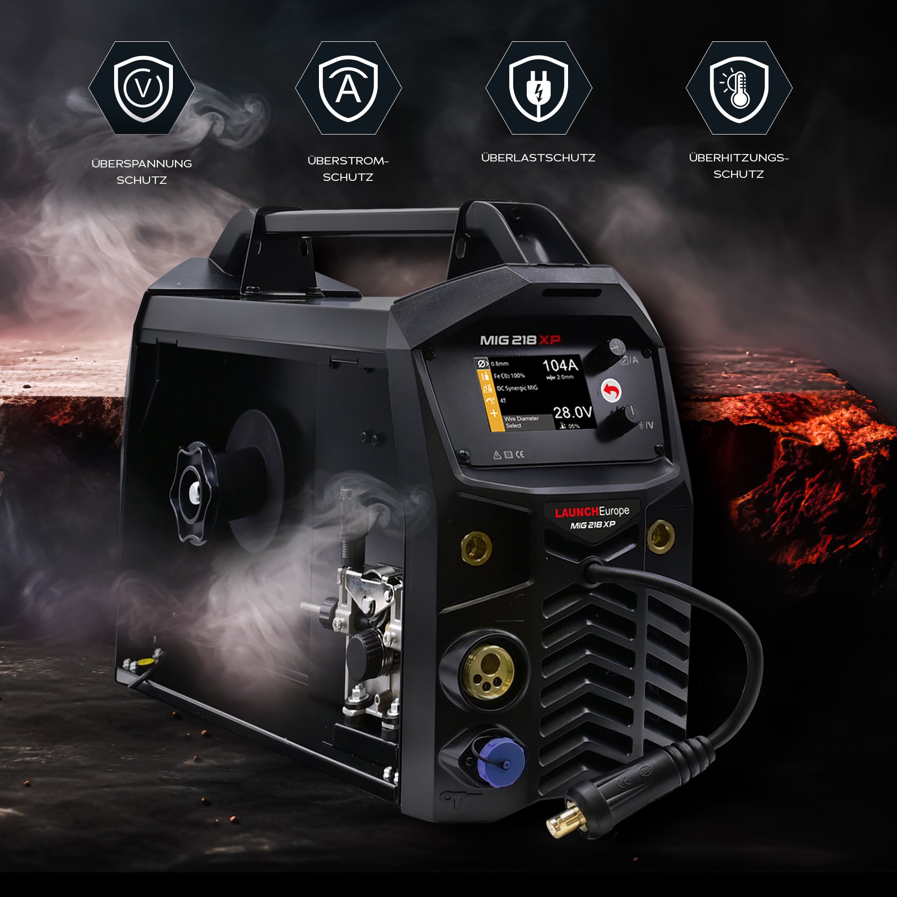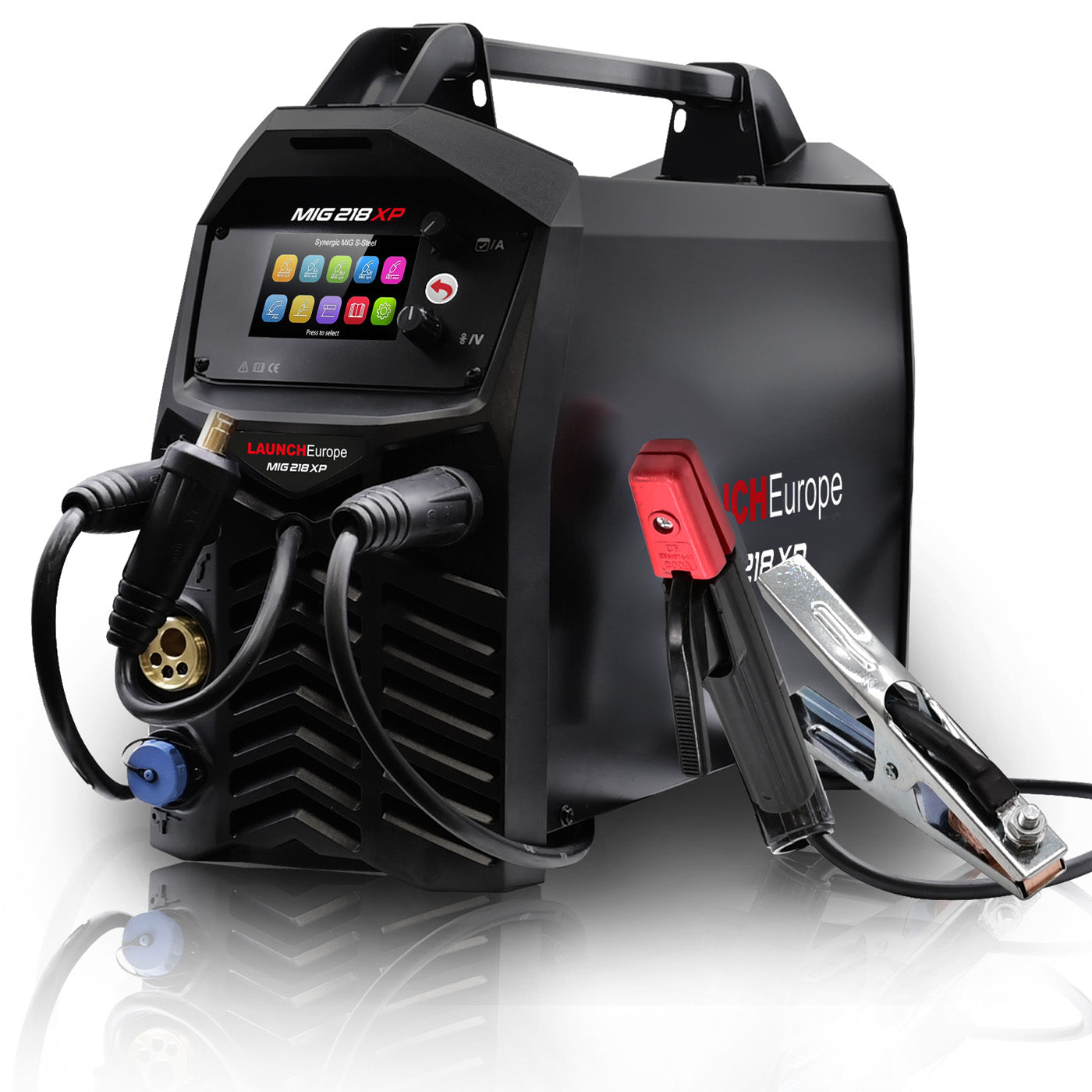 Das MIG218XP von LAUNCH ermöglicht MIG/MAG-Schweißen mit Gleichstrom (DC) und unterstützt die Verwendung von Schutzgasen (MIG, z.B. Argon) oder Aktivgasen (MAG, z.B. CO2). Der Schweißprozess wird durch einen Brennerkopf erleichtert, der Gas und Schweißdraht zuführt und das Schweißen mit einer Hand ermöglicht. Dieses Gerät bietet verschiedene einstellbare Schweißparameter und eignet sich besonders für präzise Arbeiten an dünnen Blechen, Platten und rostfreiem Stahl. Dank der Pulsfunktion ist es auch für das Aluminiumschweißen geeignet. Darüber hinaus ist das MIG 218XP voll synergetisch, was bedeutet, dass die Spannung (Volt) und der Drahtvorschub sich automatisch dem eingestellten Schweißstrom anpassen, was es auch für Einsteiger besonders benutzerfreundlich macht.