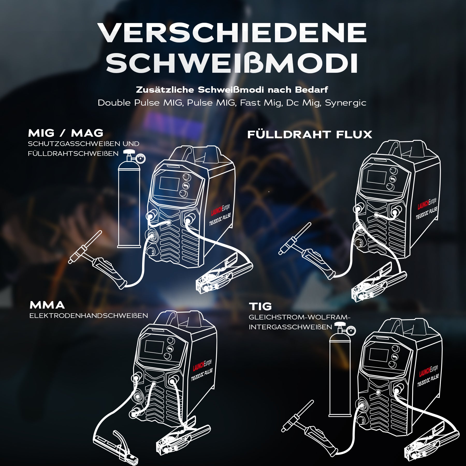 - Multifunktionale Schweißtechnologie: Kombiniert MIG/MAG, TIG und MMA Verfahren in einem kompakten Gerät für maximale Flexibilität